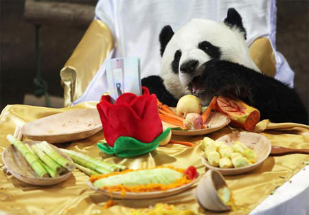 Gấu trúc mẹ Lin Hui thưởng thức trái cây trong lễ thôi nôi của con gái Lin Ping tại sở thú Chiang Mai, Thái Lan. Ảnh: EPA.
