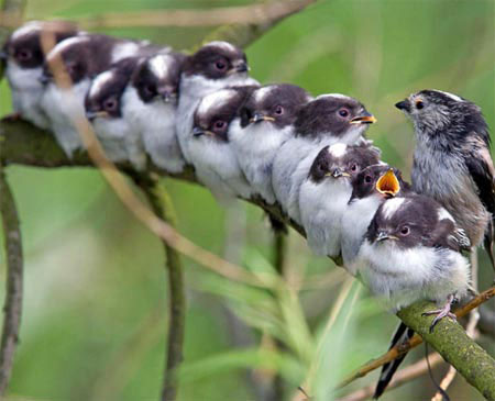 11 chim sẻ ngô đuôi dài con xếp hàng để mẹ cho ăn tại khu bảo tồn thiên nhiên ở West Yorkshire, Anh. Ảnh: PA. |