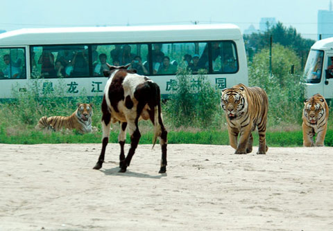 Du khách chụp ảnh đàn hổ chuẩn bị vờn con bò trong cơn đói tại Cáp Nhĩ Tân, Trung Quốc. Ảnh: Solent.