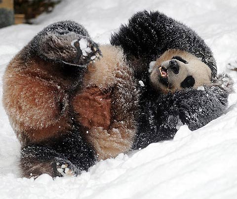 Gấu trúc Mei Xiang lăn lộn trên tuyết ở Washington DC, Mỹ. Ảnh: EPA.