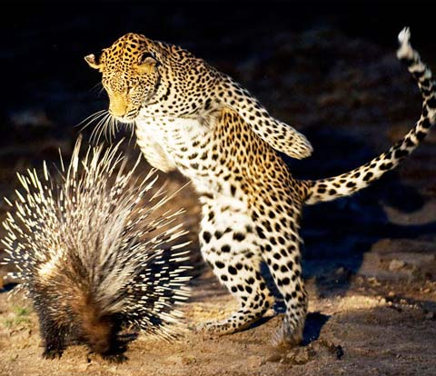Báo con vờn nhím xù lông ở Botswana. Ảnh: BNPS.