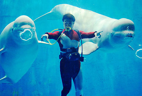 Cá voi phun bong bóng khi bơi cùng huấn luyện viên ở Hắc Long Giang, Trung Quốc. Ảnh: REX FEATURES.