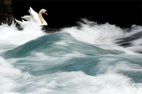 Thiên nga lướt mình trên dòng sông cuộn sóng ở Struga, Macedonia. Ảnh: Reuters.