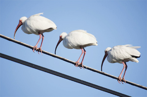 Ba con cò quăm giữ thăng bằng trên thanh sắt ở Surfside Florida, Mỹ. Ảnh: AP.