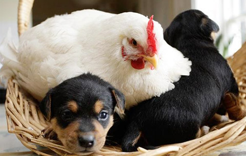 Gà mẹ Mabel ấp lên người hai con chó con tại nông trại ở Shropshire, Anh. Ảnh: NEWSTEAM.