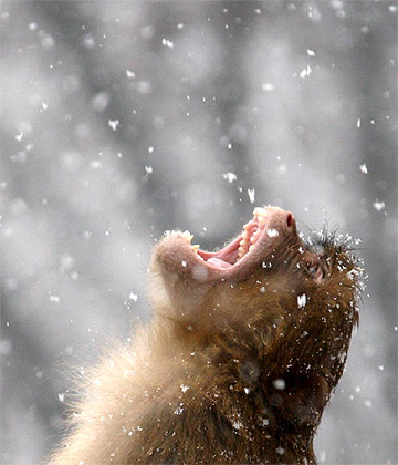 Khỉ ngửa cổ hứng những bông tuyết ở vườn thú tỉnh An Huy, Trung Quốc. Ảnh: AP.
