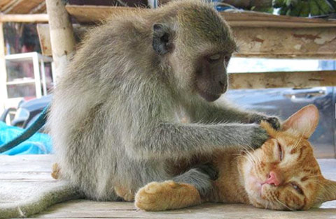 Khỉ Macaque chơi cùng mèo ở Koh Phangan, Thái Lan. Ảnh: REX FEATURES. |