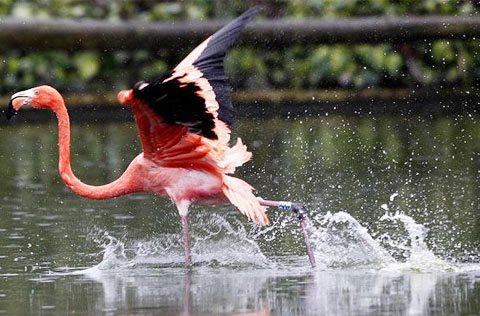 Hồng hạc lao đi trên mặt nước trong vườn thú Chester, Anh. Ảnh: PA.