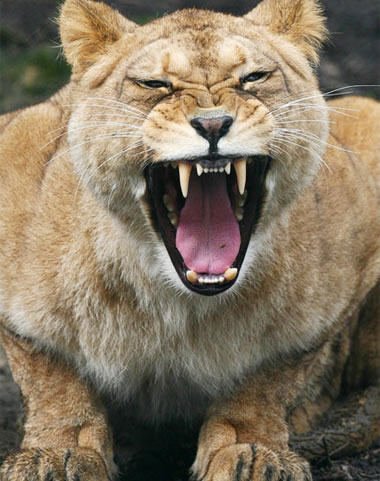 Sư tử cái Barbary khoe nanh ở công viên hoang dã Port Lympne ở Kent, Anh. Ảnh: PA.