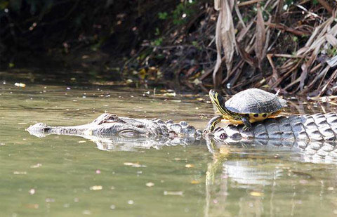 Rùa cưỡi trên lưng cá sấu ở South Carolina, Mỹ. Hai con vật này dường như trở thành đôi bạn thân. Ảnh: BARCROFT MEDIA. |