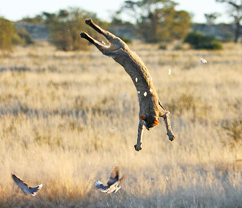 Mèo tung người nhào lộn trong khi cố vồ chim bồ câu ở biên giới giữa Nam Phi và Botswana. Ảnh: Solent.