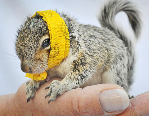 Sóc con Crunchy với chiếc đầu băng bó tại trung tâm động vật hoang dã ở Surrey, Anh. Ảnh: Solent.