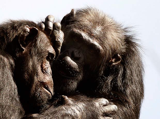 Hai chú tinh tinh âu yếm với nhau tại vườn thú Edinburgh. |