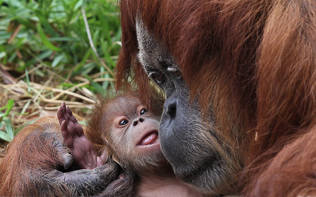 Rochale, một chú vượn Sumatra 41 tuổi giữ chú vượn con mới sinh của mình tại công viên Ramat Gan gần Tel Aviv, Israel. |