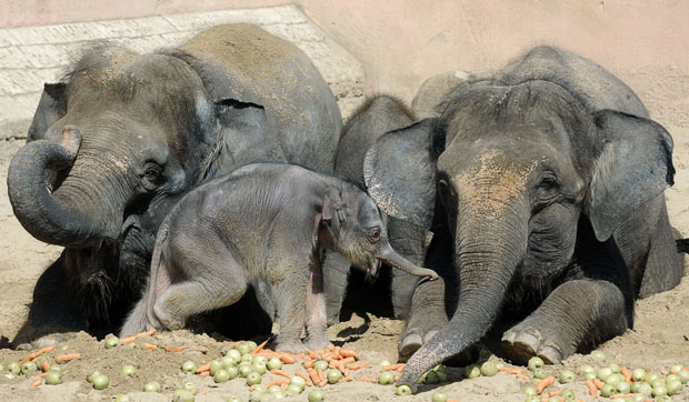 Một con voi con năm ngày tuổi bước vào chuồng bên cạnh voi mẹ Manari ở vườn thú ở thành phố phía Bắc của Hanover- Đức. |