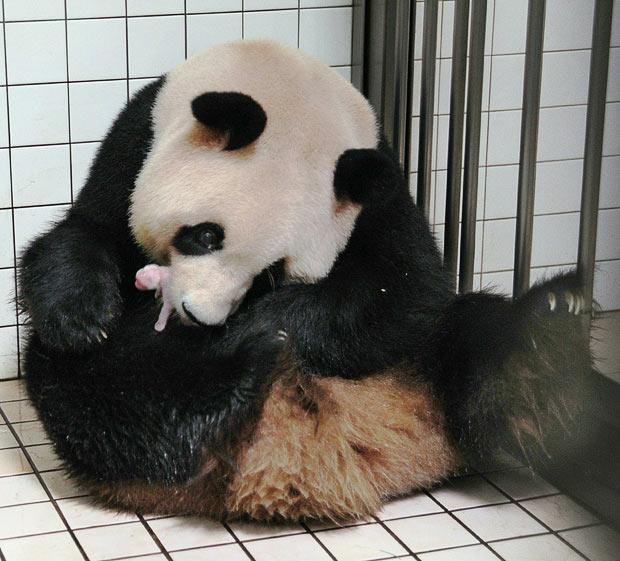 Chú gấu trúc Rauhin giữ chú gấu con sơ sinh sau khi sinh cặp gấu song sinh ở công viên động vật Nhật Bản Adventure World tại Shirahama. |