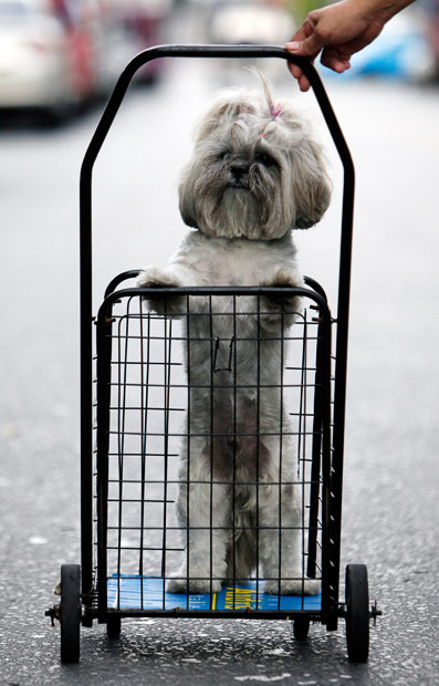 Chú chó giống Shih-Tzu tên “Cookie” đứng trong một chiếc xe đẩy |