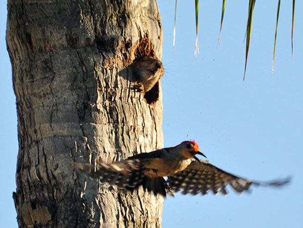 Nhiếp ảnh gia động vật hoang dã Howard Reid đã quan sát được một tổ chim gõ kiến bụng đỏ tại nhà của ông tại Florida, Mỹ, đang chiến đấu với một con sóc trong niềm tuyệt vọng cứu chiếc tổ của mình. Kết thúc trận chiến trên, chú chim bất bình thừa nhận thất bại và bay ra ngoài tìm nơi để bắt đầu xây dựng lại “ngôi nhà” của mình. |