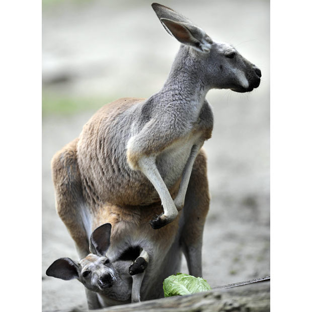 Một con kangaroo bốn tuần tuổi ghé mắt nhìn ra từ túi của kangaroo mẹ |