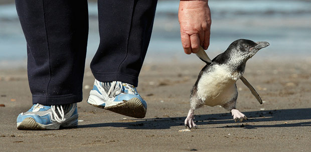 Anh Annwyne Stanish với “bước chân hy vọng” của chú chim cánh cụt nhỏ màu xanh đang đi trên bãi biển vịnh Rothesay, gần Auckland, New Zealand. Chú chim cánh cụt, được vớt lên ở bãi biển Muriwai với chấn thương ở đầu và chân, đã được một tình nguyện viên cứu hộ chim Sylvia Durrant và Annwyne Stanish chăm sóc và hồi phục sức khỏe nhanh chóng. |