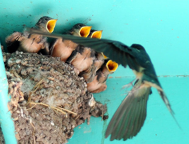 Những con chim con chờ đợi chim mẹ mớm mồi trong chiếc tổ bên ngoài một ngôi nhà ở Madrid, gần Santa Fe, New Mexico. |