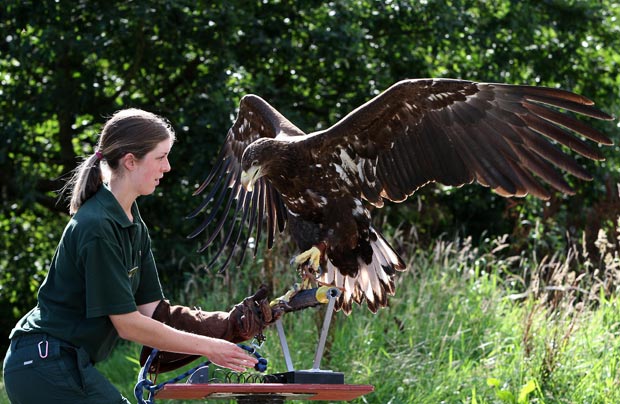 Falconer Laura Downie với con đại bàng biển ba tuổi trong bữa ăn nhẹ ở công viên Blair Drummond gần Stirling, Anh. |