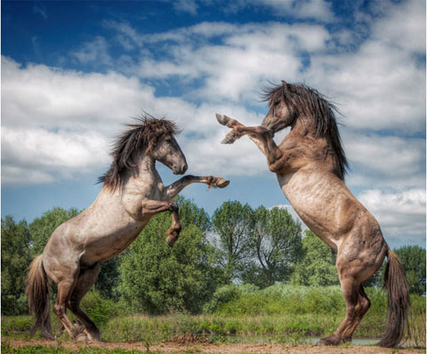 Hai con ngựa đực giao chiến để phân định vị trí đầu đàn trong khu bảo tồn thiên nhiên ở Loevenstein, Hà Lan. (Ảnh: Solent News).