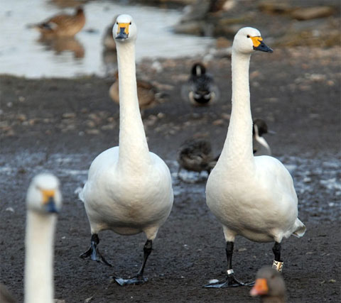 Một đôi uyên ương thiên nga dạo chơi bên hồ nước trong trung tâm bảo tồn Slimbridge Wetland, hạt Gloucestershire, Anh. Thiên nga là loài có tập tính kết đôi với nhau cả đời, nhưng các chuyên gia của trung tâm cho biết, con thiên nga đực đã bỏ rơi một con cái khác để cặp kè với bạn tình mới trong mùa đông năm nay. (Ảnh: PA).
