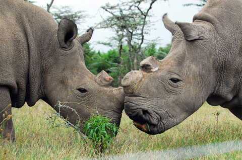 Hai con tê giác trắng đực trong khu bảo tồn Ol Peteja của Kenya đọ sức dù chúng không còn sừng, vũ khí duy nhất của chúng. Với số lượng chỉ còn 8 con trên toàn thế giới, tê giác trắng đang đối mặt với nguy cơ tuyệt chủng cực cao. Các chuyên gia của khu bảo tồn Ol Peteja hy vọng hai con đực và hai con cái mà họ đang bảo vệ sẽ giao phối với nhau để sinh ra thế hệ sau, cứu cả loài khỏi họa tuyệt chủng. (Ảnh: Barcroft Media).