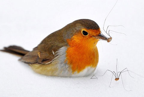 Chim cổ đỏ tóm được một con nhện trên tuyết ở Essen, Đức. (Ảnh: EPA).