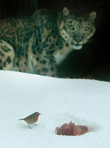 Báo tuyết đứng nhìn chim cổ đỏ bên miếng mồi của nó tại vườn thú Dublin, Anh. (Ảnh: EPA).