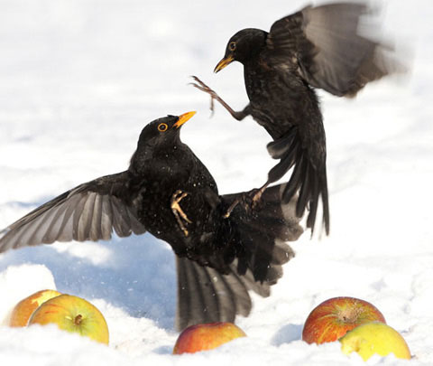 Đôi chim két hỗn chiến giành thức ăn ở South Yorkshire, Anh. (Ảnh: Solent).