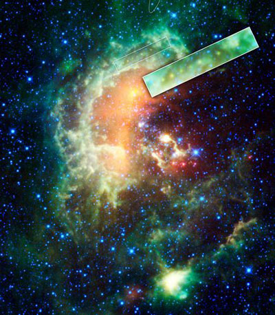 Những chấm nhỏ màu vàng ở phía trên đám mây bụi khí hình lưỡi liềm là đường đi của một thiên thạch khi nó bay qua phía trước tinh vân Tadpole. Thiên thạch thuộc hệ Mặt Trời, còn tinh vân Tadpole cách trái đất chừng 12.000 năm ánh sáng. Ảnh: NASA.