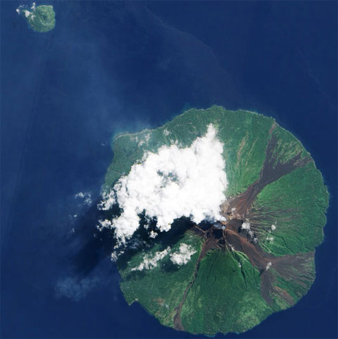 Một đám mây trắng bay qua núi lửa Manam tại Papua New Guinea trong lúc nó phun khói. Ảnh: NASA.