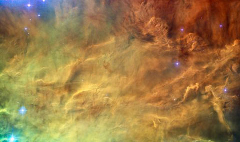 Vô số đợt sóng bụi và khí bay qua các ngôi sao trong tinh vân Lagoon. Trong ảnh có màu đỏ (khí hydro), màu xanh lục (khí nitơ) và màu xanh dương (các ngôi sao). (Ảnh: NASA.)