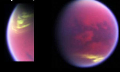 Khí etan tạo nên đám mây màu vàng trong bầu khí quyển Titan, một vệ tinh của sao Thổ. Đám mây tan dần khi mùa đông tràn tới cực bắc của Titan. Mùa đông trên Titan kéo dài tới 7 năm. (Ảnh: NASA.)
