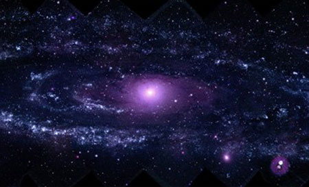 Ảnh góc rộng về thiên hà Andromeda được chụp bằng camera cực tím. Thiên hà này có chiều dài 220.000 năm ánh sáng và cách trái đất 2,5 triệu năm ánh sáng. (Ảnh: AFP).