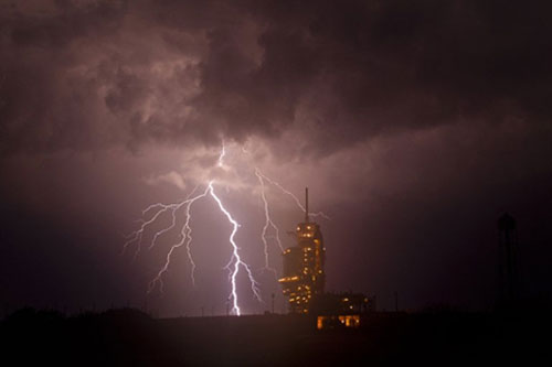 Sét đánh xuống một nơi gần tàu vũ trụ Endeavour của Mỹ khi nó nằm trên bệ phóng tại Trung tâm Vũ trụ Kennedy, bang Florida.