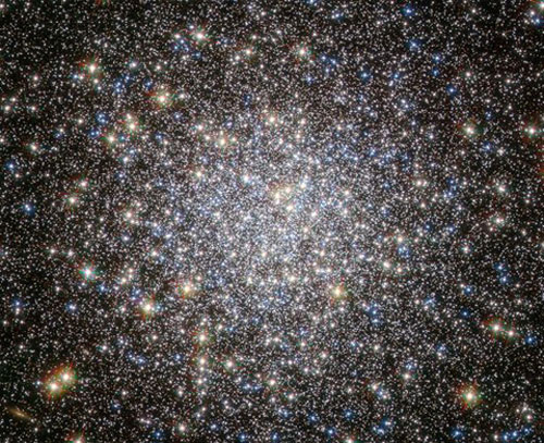 Những ngôi sao già và lạnh (màu vàng) tỏa sáng cùng những ngôi sao mới sinh và nóng (màu xanh) trong chòm sao M5. Đây là một trong những chòm sao già nhất trong dải Ngân Hà. Phần lớn ngôi sao trong M5 hình thành cách đây hơn 12 tỉ năm. Ảnh: NASA.